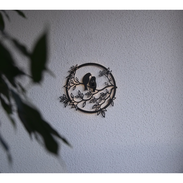 Geef je tuin of balkon een warme en romantische uitstraling met deze solar wanddecoratie van twee love birds op een tak. Overdag een stijlvol metalen silhouet, en zodra het donker wordt zorgt de verlichting voor een zachte, sfeervolle gloed.